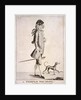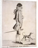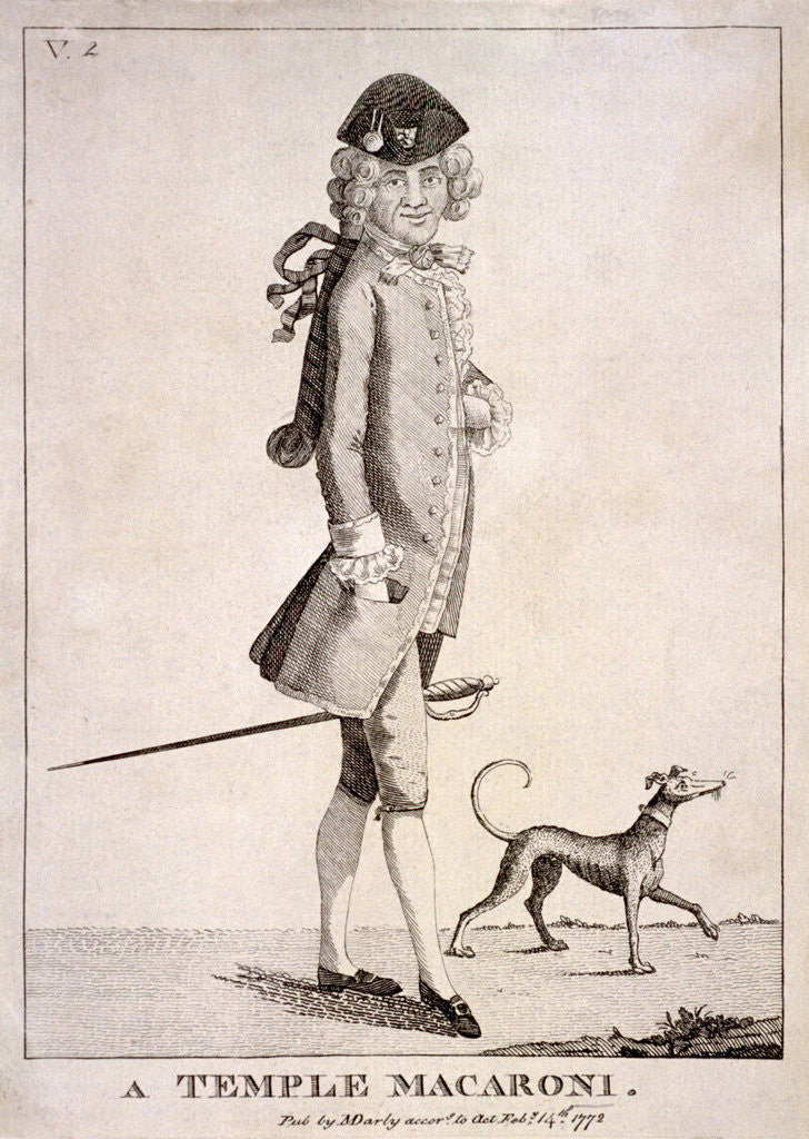 'A Temple Macaroni', 1772; an exquisite with a waist-length pigtail and a simpering expression minces along while a dog, also with a long tail, trots along beside him. Possibly a reference to Richard Grenville-Temple, first Earl Temple. A macaroni was an eighteenth century British dandy who affected continental fashions.