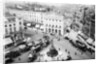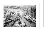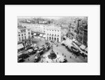 A view of Piccadilly Circus, c1912-c1914. A rooftop view looking down on the Statue of Eros, with lines of buses and cars.