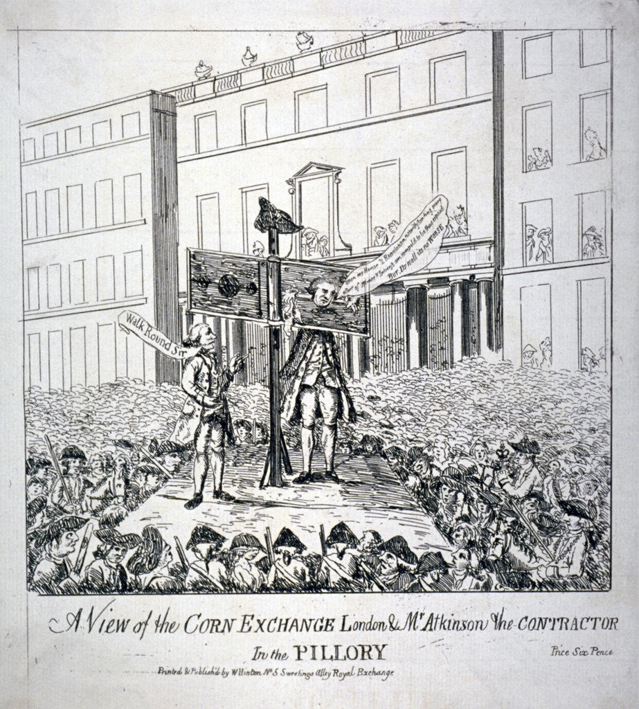 'A view of the Corn Exchange...', 1785. Christopher Atkinson standing in the pillory surrounded by a horde of people. He was at the time convicted of shady dealing in connection with the purchase of malt from the Navy Victualling Board.