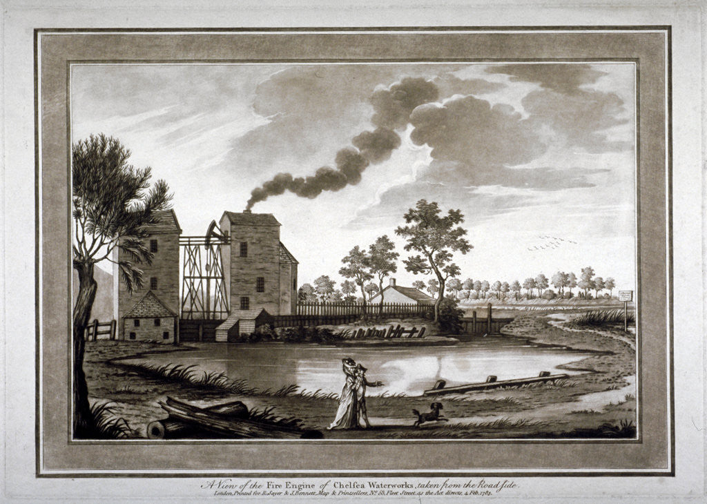 'A view of the fire engine of Chelsea Waterworks taken from the roadside', 1783. View showing the pumping engine and reservoir of Chelsea Waterworks, London.