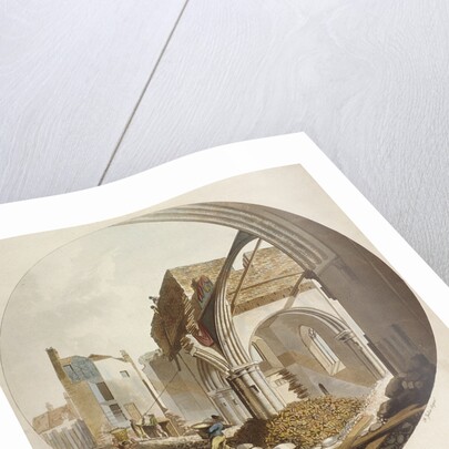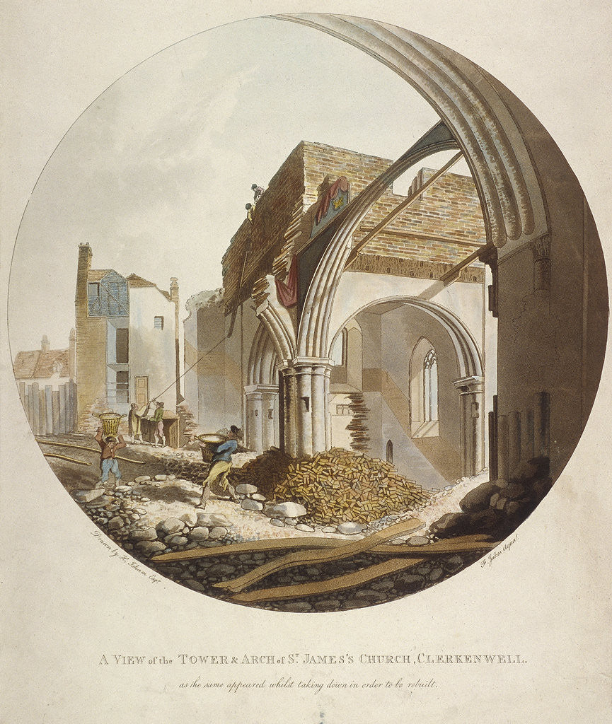 'A view of the Tower and Arch of St James's Church, Clerkenwell', Islington, London, 1789. Parts of the church lie exposed as builders go about construction work. Set within a circular composition.
