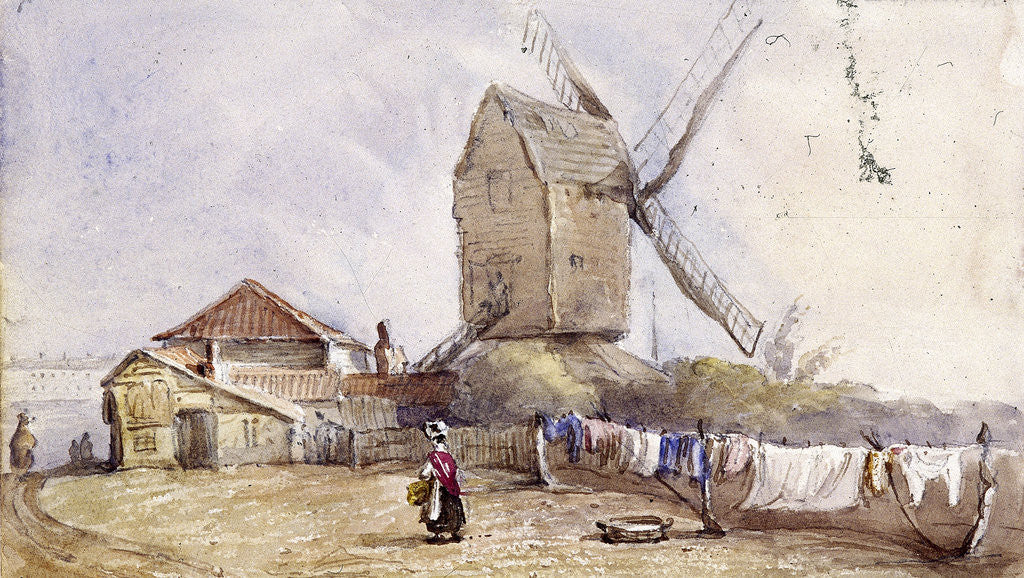 A windmill on Blackheath, London, 1833. With a woman and washing line in the foreground.