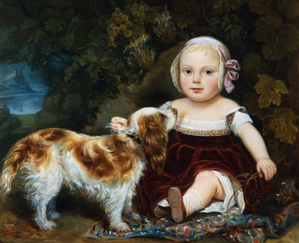 Product images of A Young Child with a Brown and White Spaniel by a Leafy Bank
