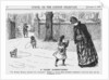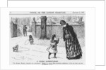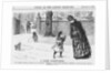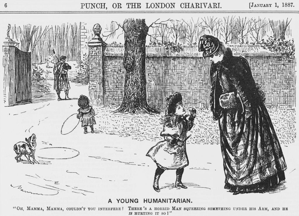 'A Young Humanitarian', 1887. A little girl, hearing the bagpipes' music, is scared that the gentleman in a kilt is hurting some poor animal. In the foreground, the little dog howls in sympathy with the music. From Punch, or the London Charivari, January 1, 1887.