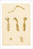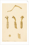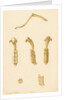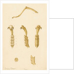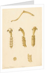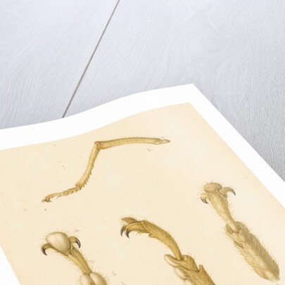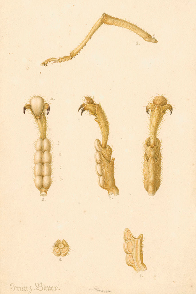 Plate 21 figures 1-6 from the paper 'Farther observations on the feet of animals whose progressive motion can be carried on against gravity', by Everard Home, Philosophical Transactions of the Royal Society, vol.106 (1816), pp.322-330. Six views and details of legs from an unspecified variety of cricket from Abyssinia ('Gryllus') at x9 and x100 magnification. Signed lower left 'Franz Bauer'. Royal Society stamp verso with an inscription in ink 'Fig: 1. magnified 9 times. Figs: 2,3,4,5,6 100 times.'