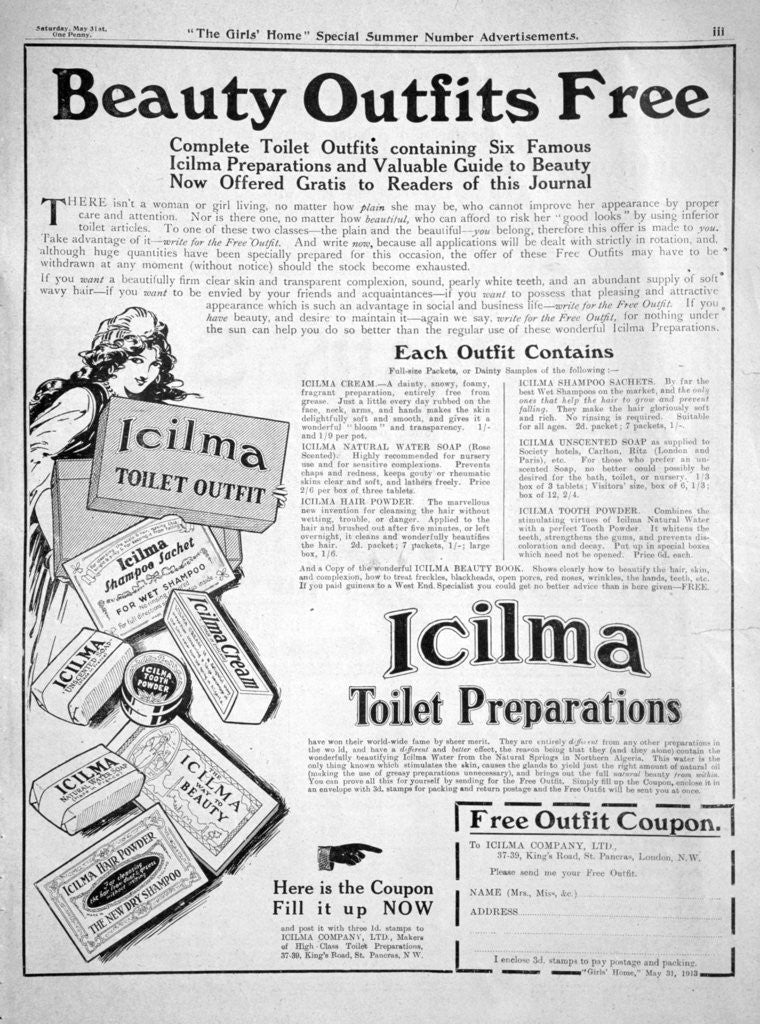 Advert for Icilma Toilet Preparations, 1913. A Print from The Girls' Home, 31st May 1913.