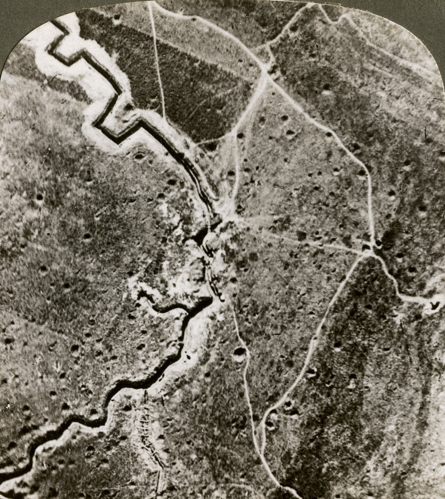 Aerial photograph of the German lines, World War I, 1914-1918. View showing deep trenches, mine and shell craters. Stereoscopic card detail.