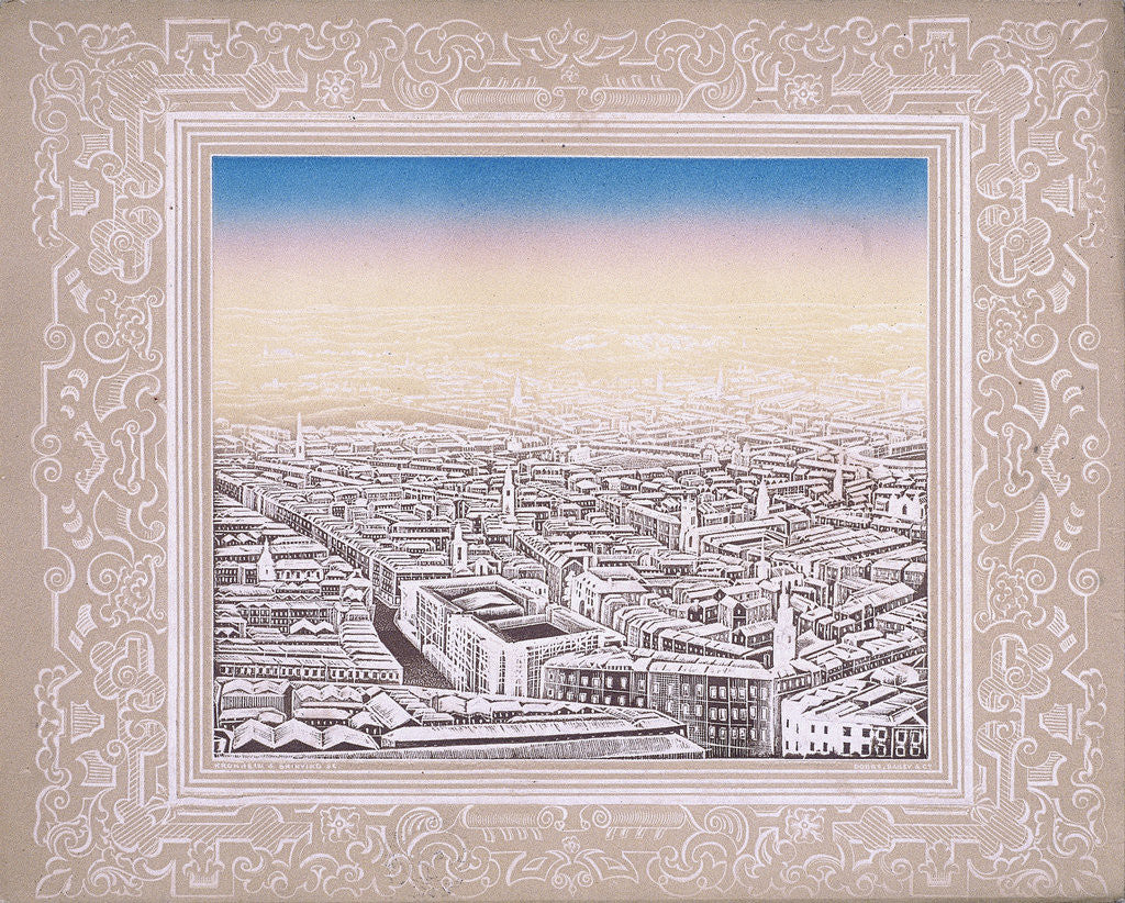 Aerial view of London with decorative border, c1845. Unnatural colours have been used in the decoration of the background of a detailed panorama of London.