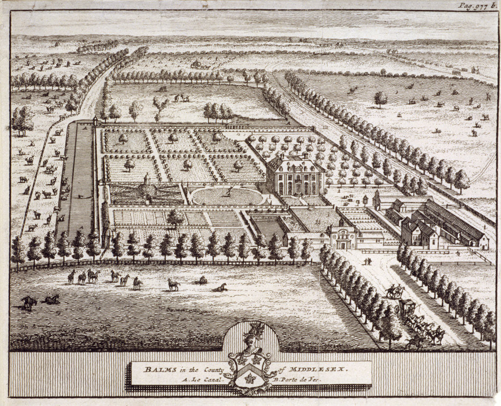 Aerial view of the estate belonging to Baumes House, Hoxton, London, c1600. The house is set in extensive grounds, part of which has been laid out as formal gardens, with stables and a kitchen garden to the right. A coach and horses moves off down the drive. The estate is surrounded by open country with horses and deer grazing.