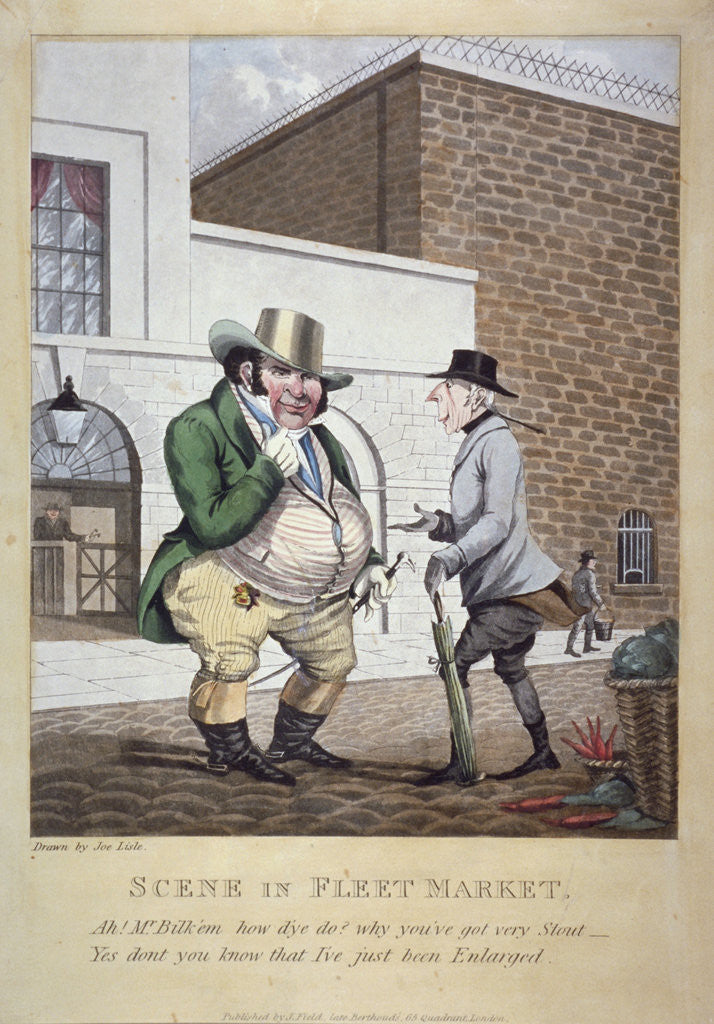 'Ah! Mr Bilk'em how d'ye do? ...', c1825. Two men meet outside Fleet Prison. One is old, thin, poor and respectable the other obese and flashily dressed. Satire on the way in which advantage could be taken of the bankruptcy laws or of the periodical acts for the relief of debts.