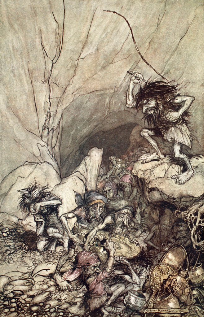 'Alberich drives in a band of Nibelungs with gold and silver treasures', 1910. Illustration from The Rhinegold and the Valkyrie. Alberich makes the Nibelung dwarves bring his treasures to the cave so he can survey his booty. From Das Rheingold. From a private collection.
