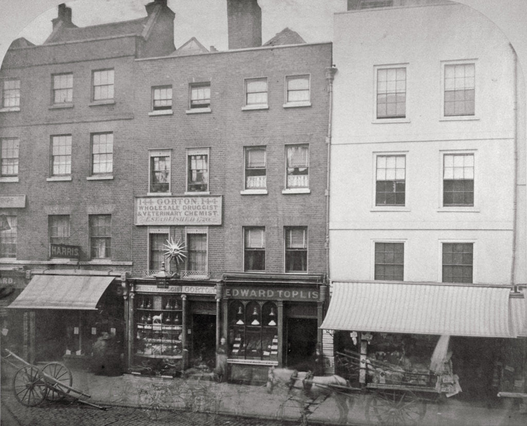 Aldgate High Street, City of London, 1875. View of premises facing Butcher Row, east of St Botolph Aldgate, Aldgate High Street. The businesses include Gorton, druggist and veterinary chemist.