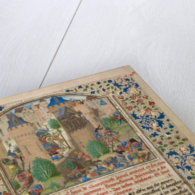 Alexander Fights in the Town of the Sudracae; Master of the Jardin de vertueuse consolation and assistant, Flemish, active 3rd quarter of 15th century; Lille (written), France, Europe; about 1470 - 1475; Tempera colors, gold leaf, gold paint, and ink on parchment