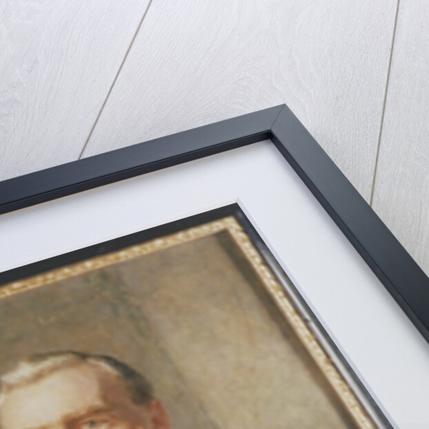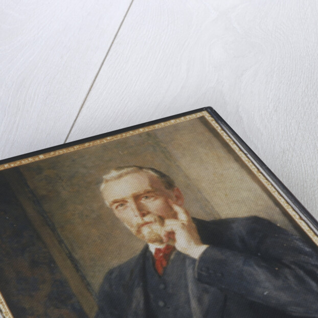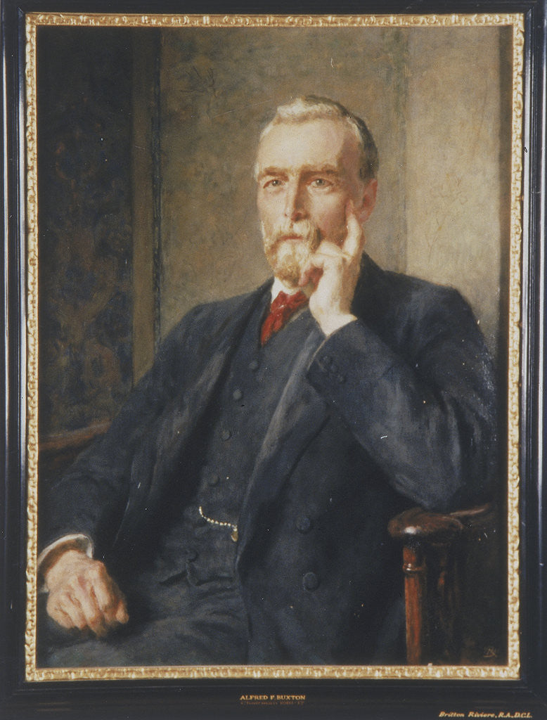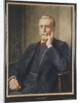 'Alfred Fowell Buxton', 1917. Seated portait of a bearded man, resting one hand on his cheek. The chain of his watch is just visible attached to his waistcoat.