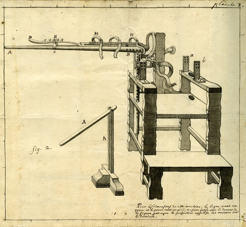 Illustration of the 'Ambe of Hippocrates', described a most 'ancient and famous' contraption. It was designed for correcting luxated (dislocated) shoulders/ arms. This is a 'new Ambe' modified and improved by Le Cat and presented to the Royal Society. The lever at A has the injured arm rest upon it, whilst the vertical piece of wood at B rests alongside the patient's body- the two pieces joining and forming a hinge in the patient's armpit. The patient is tied to the chair in order to provide support. An assistant would then 'bear on the scapula and the clavicle' whilst another pressed down the lever (A). Thus 'making the bone come into its place again'. It was thought that this position was favourable as it relaxed the muscles and allowed them to stretch equally. This method was though most effective and reduced recurring luxations (dislocations). Image 1 from Ambi Nouveau (for reducing luxations of the arm with the shoulders rectified) by Claude Le Cat FRS, 17th Feb 1742/3. Ph. Tr. 42 387