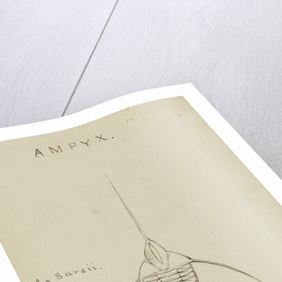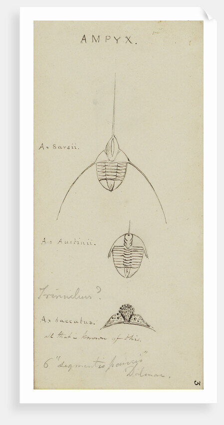 Drawing of Ampyx, a genus of trilobite, with annotations. Taken from a notebook by Henry James.