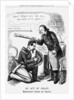 'An Act of Grace; Montalbert Pardons the Emperor', 1859. The story behind the cartoon is the trial of the Comte de Montalembert. The Comte had published a pamphlet called Un Debat sur l'Inde au Parlement Anglais in which he compared in unflattering terms French parliamentary procedures for debate with the superior ones of the British parliament. Napoleon was outraged. For this crime, Montalembert was found guilty, fined 3,000 francs and sentenced to six months' imprisonment. In December, he was pardoned by Napoleon, but when Montalembert appealed against his conviction, he was again found guilty. Towards the end of December, he was again pardoned by Napoleon. Here, Montalembert is shown 'forgiving' Napoleon for having saved him from prison. Napoleon kneels in front of Montalembert as though he is to be knighted by a British sovereign and, with a rolled up copy of the offending pamphlet, Montalembert prepares to oblige. From Punch, or the London Charivari, January 8, 1859.