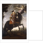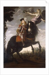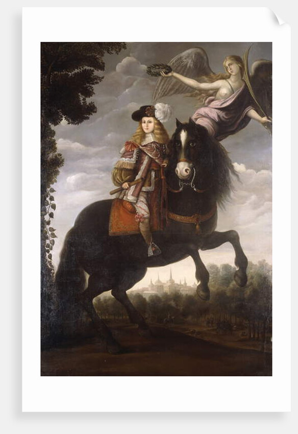 Full length, in a Red Coat with White Trim being Crowned with a Laurel by an Angel, Madrid in the Distance, c.1685