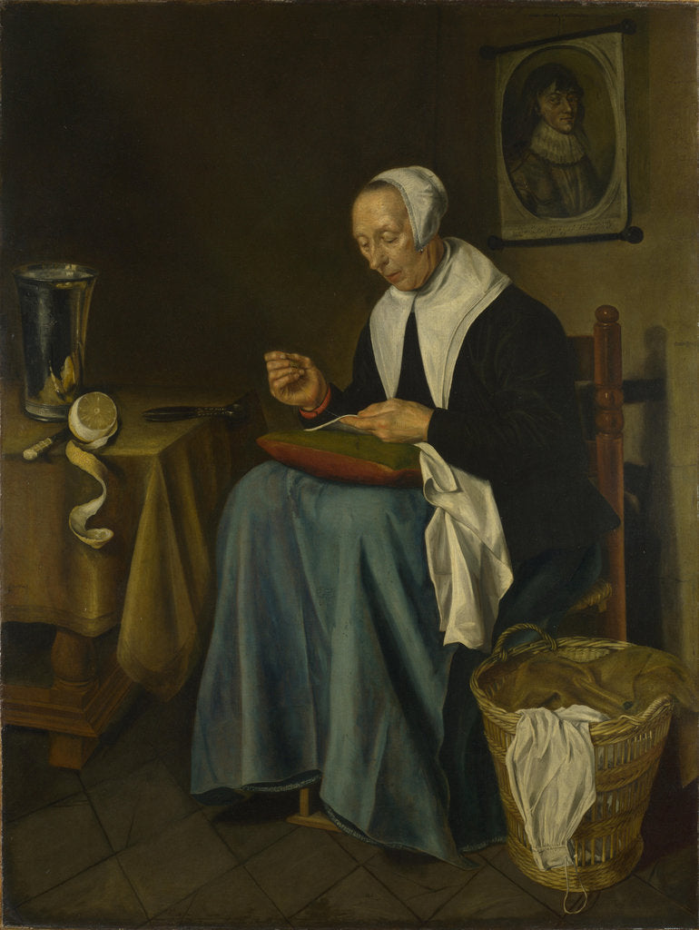 An Old Woman seated sewing, 1655. Found in the collection of the National Gallery, London.