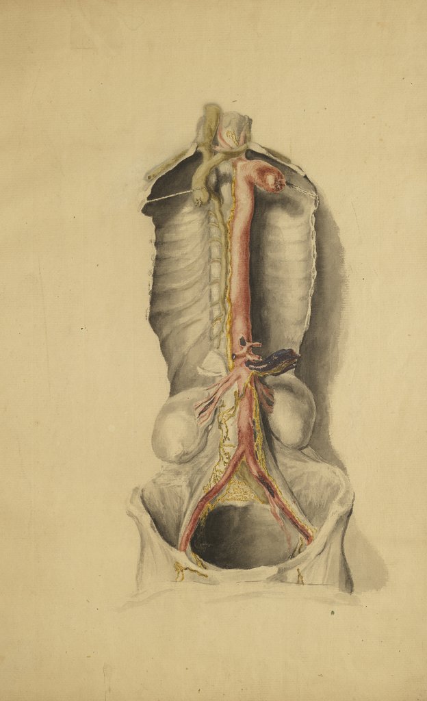 Anatomical study of the thoracic duct. Original caption: 'The trunk of a human subject'. Illustration for William Hewson's A description of the lymphatic system in the human subject, and in other animals. Illustrated with plates. Together with observations on the lymph, and the changes which it undergoes in some diseases (London,1774).