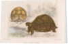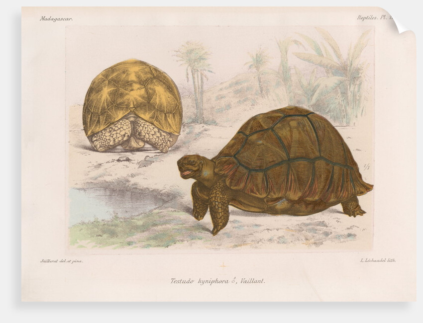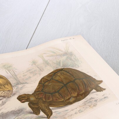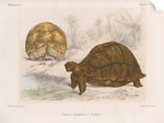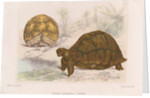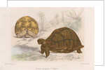 Zoological study of the male angonoka tortoise Astrochelys yniphora(here styled Testudo hyniphora). The reptile is shown in a landscape at a forest edge with water. A second tortoise, sheltering in its shell, appears in the background. The tortoise is native to Madagascar and was first described by Léon Vaillant in 1885.