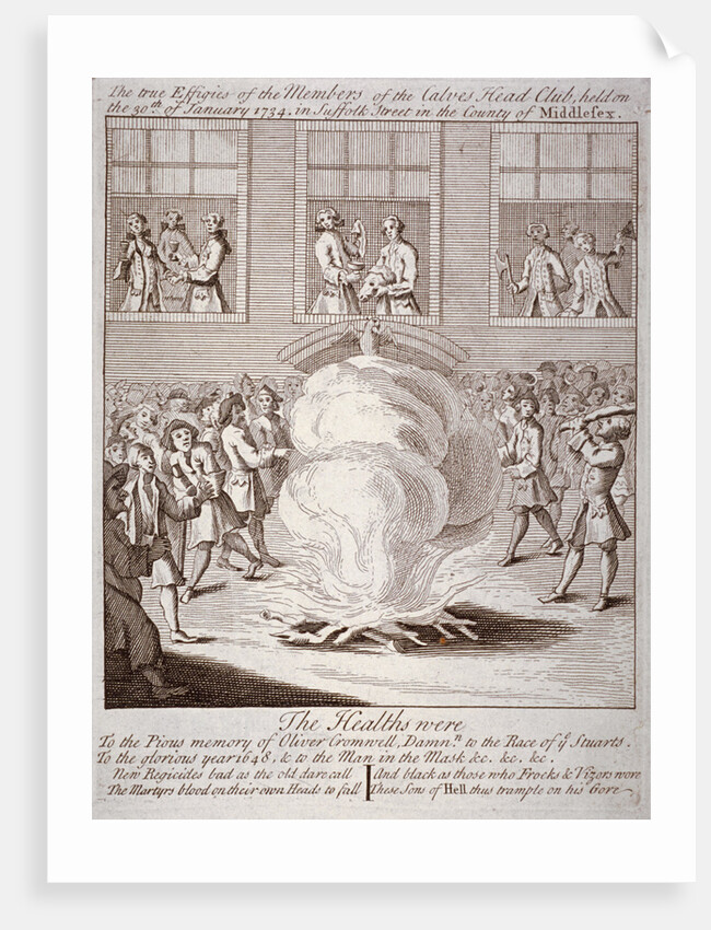 Anti-Cromwell demonstration, Suffolk Street, London, 1735. The true Effigies of the Members of the Calves Head Club, held on the 30th of January 1734 in Suffolk Street. View of the Golden Eagle, Suffolk Street. Among drinkers at the windows, one holds an axe, another a calf's head. The Club was pro-Cromwell and on 30th January 1734 its provocative actions so infuriated people that they stoned the inn where the members were meeting.
