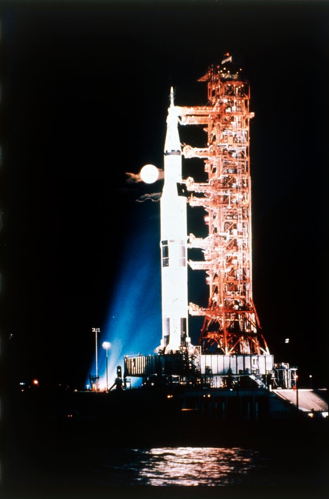 Apollo 9 Saturn V rocket with full moon, 1969. This rocket, shown here on its launch pad at the Kennedy Space Centre, Cape canaveral, Florida, USA, launched Apollo 9 on 3 March 1969, carrying astronauts James McDivitt, David Scott and Russell Schweickart, into earth orbit where they tested the full Apollo moon craft for the first time. The Saturn V was the largest rocket ever built and was used on all Apollo missions to the moon.