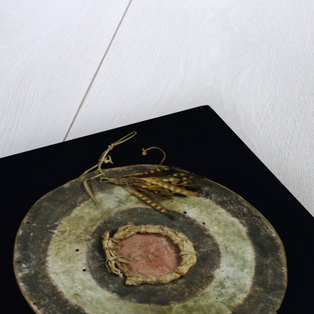 Product details Arapaho painted hide shield, with yellow and brown striped feathers attached at the top