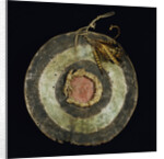 Arapaho painted hide shield, with yellow and brown striped feathers attached at the top