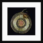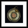 Product images of Arapaho painted hide shield, with yellow and brown striped feathers attached at the top