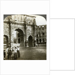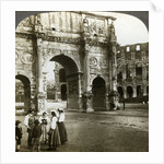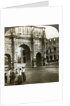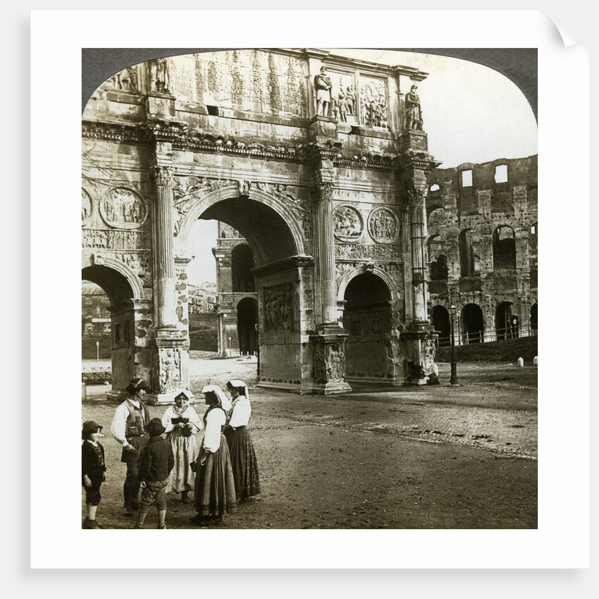 Arch of Constantine, Rome, Italy. The Arch of Constantine is a triumphal arch in Rome, situated between the Colosseum and the Palatine Hill. It was erected to commemorate Constantine I's victory over Maxentius at the Battle of Milvian Bridge on 28th October 312. Stereoscopic card detail.