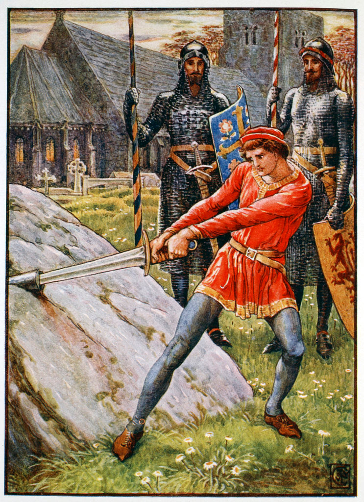 'Arthur Draws the Sword form the Stone, 1911. The young Arthur pulls the sword from the stone to become King of England. Frontispiece of Stories of the Knights of the Round Table by Henry Gilbert, first edition, 1911.