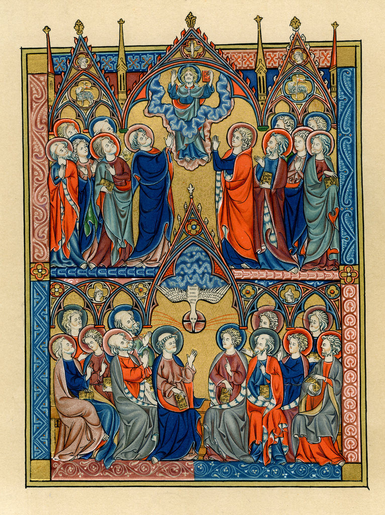 Ascension and Pentecost, 1290-1300. From La Somme Le Roy, produced in France. Illustration from Illuminated Manuscripts in the British Museum, Miniatures, Borders, and Initials by George F Warner, series I, (British Museum, London, 1899).