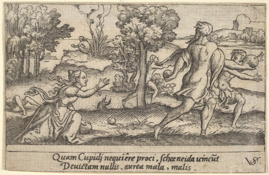 Atalanta and Hippomenes, in the foreground Atalanta kneeling to pick up an apple an…, ca. 1535-62