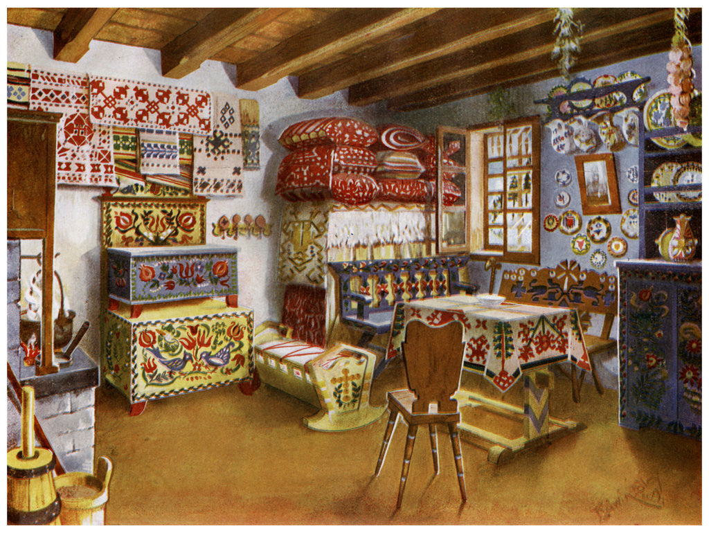 Austro-Hungarian peasant furniture, 1911-1912. A living room furnished with traditional patterns. A print from The Book of Decorative Furniture its Form, Colour and History, Volume II by Edwin Foley, TC and EC Jack Ltd, London, 1911-1912.