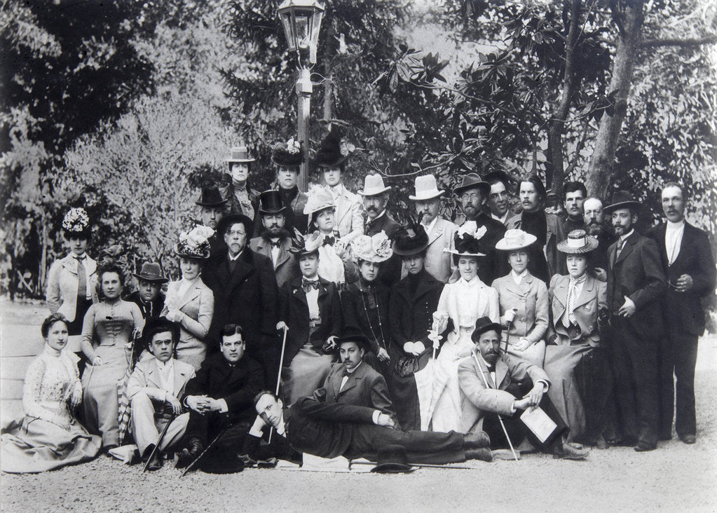 Author Maxim Gorky and Anton Chekhov between the actors of the Moscow Art Theatre, 1900