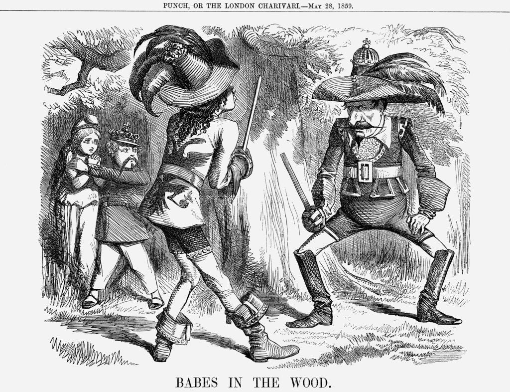 'Babes in the Wood', 1859. Napoleon III left the Regency of France in the hands of the Empress Eugenie and left Paris to join the Italian army. The Franco-Austrian war began on 26th April 1859. Napoleon met King Victor Emmanuel of Italy at Genoa on 13th May 1859. This cartoon depicts Napoleon facing up to the representative of the Austrian army, identifiable by the two-headed eagle emblem on his back. In the background, Victor Emmanuel of Sardinia (crowned King Victor Emmanuel II of Italy at Turin in 1861) shields an anxious Italy as she awaits the outcome of the battle. From Punch, or the London Charivari, May 28, 1859.