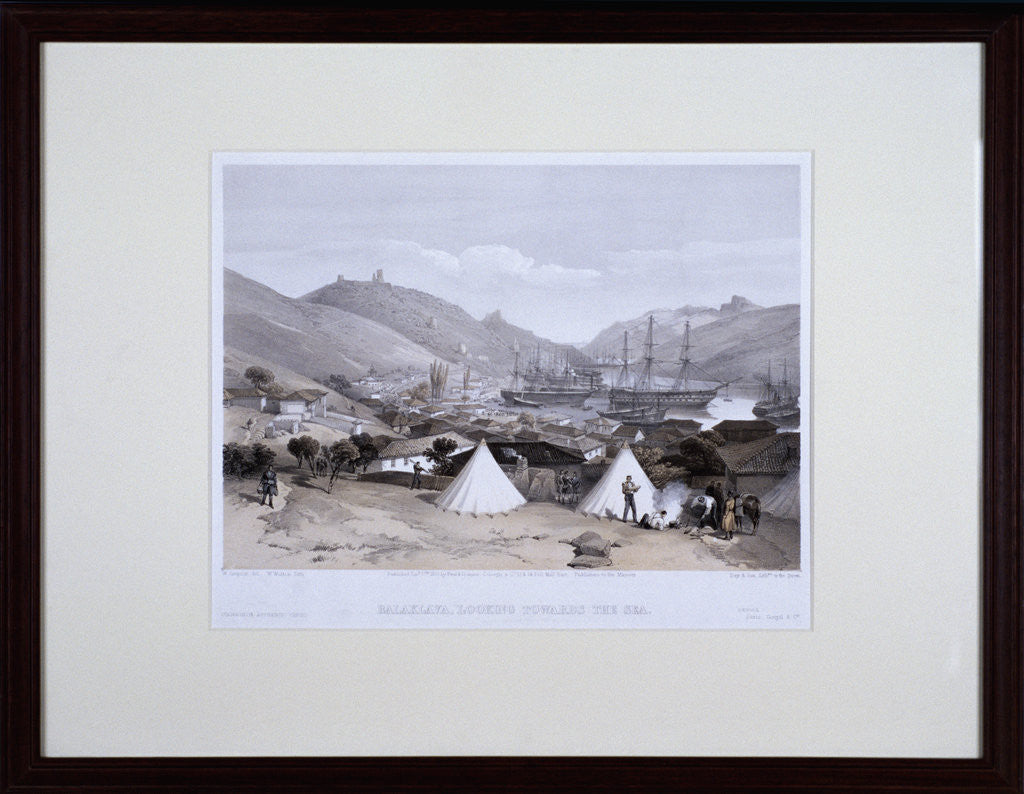 'Balaklava Looking Towards the Sea', 1855; view of Balaclava Harbour looking towards the Black Sea at the time of the Crimean War. Part of an army camp can be seen in the foreground, with houses close to the waterfront and ships on the water. High on the hills above the harbour is the Genoese Castle.