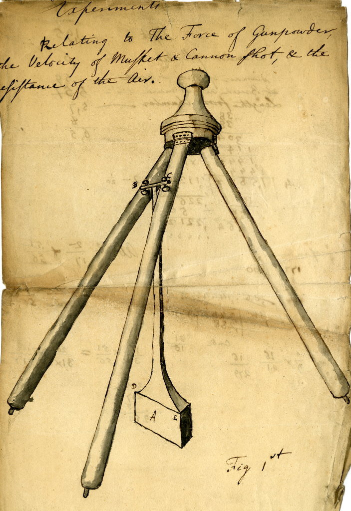 Study of Benjamin Robins’ machine for determining the velocity of bullets. Headed: ‘Experiments relating to The Force of Gunpowder, the Velocity of Musket & Cannon shot, & the resistance of the Air’. Below ‘Fig. 1st.