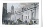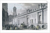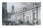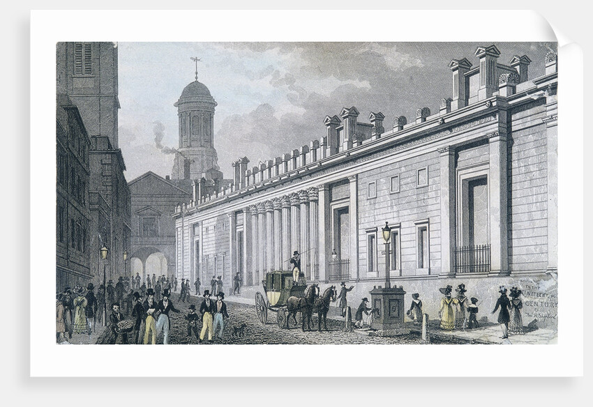 View of east front of the Bank of England, Threadneedle Street, London, 1828, from St Bartholomew Lane; showing the new tower of the Royal Exchange. Also showing a busy street scene with horse drawn carriage and a water pump.