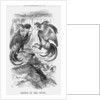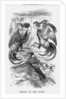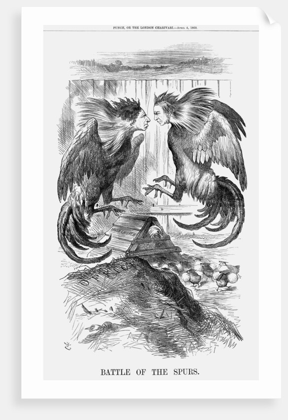 'Battle of The Spurs', 1868. The Liberal MP Mr Gladstone believed that, in view of the recent Fenian outrages, that moves to redress agrarian grievances and reassess the privileges of the Anglican Church in Ireland might be the first blocks to be laid in the process of reconciliation. This cartoon therefore refers to Gladstone's presentation of a plan which moved to abolish the Irish Church as a state church. This resolution was carried at the end of April 1868, at which time he proposed a Bill suspending appointments in the Irish Church until the question of its disendowment and disestablishment had been settled. The Bill was rejected in the House of Lords. Here, the two cockerels, Disraeli on the left, and Gladstone on the right, prepare for battle whilst Mother Church calls her little scholars inside, out of harm's way. This relates to the fact that the second part of Mr Gladstone's speech on 16th March related to the question of National Education in Ireland. From Punch, or the London Charivari, April 4, 1868.