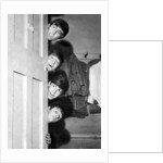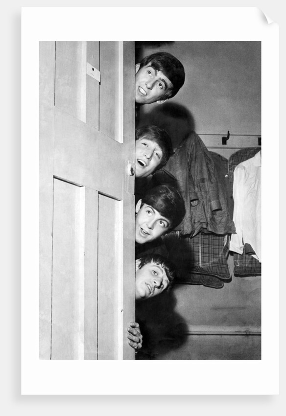 The Beatles peering out from behind their dressing room door before their appearance at the Odeon Theatre in Manchester. Top to bottom: George Harrison, John Lennon, Paul McCartney and Ringo Starr. 30th May 1963.