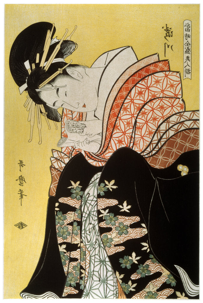 'Beauty Takigawa from the Tea-house Ogi', late 18th or early 19th century. From the series The famous Beauties of Our Days. Found in the collection of the State A Pushkin Museum of Fine Arts, Moscow.