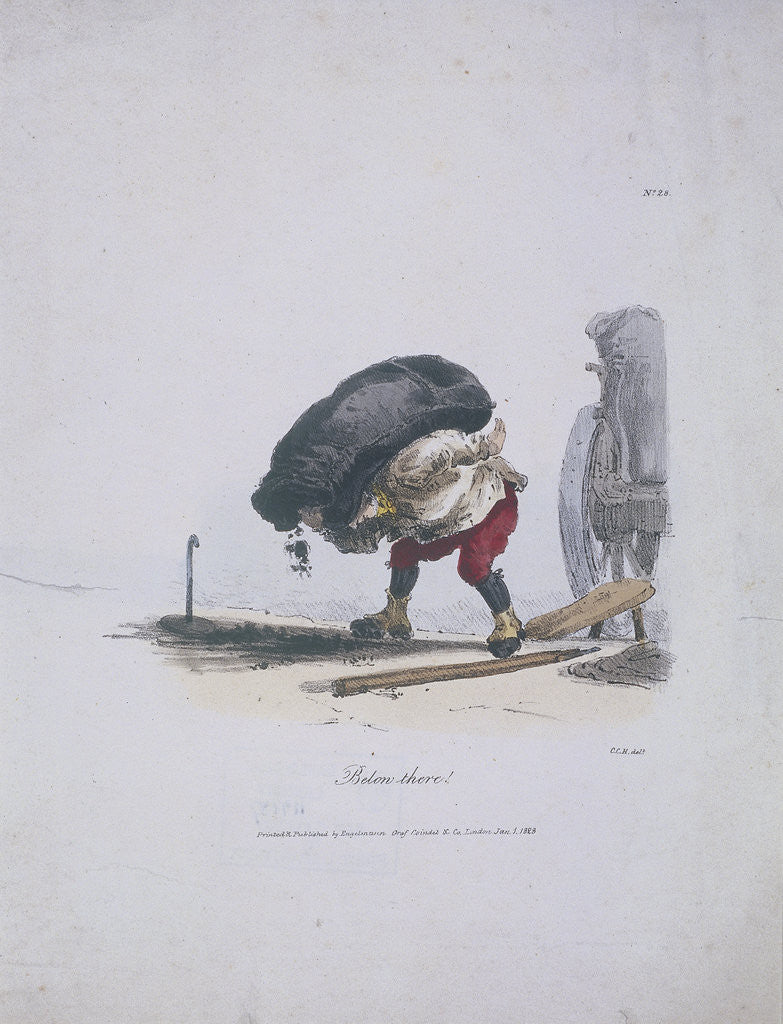 'Below there!' View of a coalman bent double as he removes a heavy sack of coal from his cart. From Cries of London, 1828.