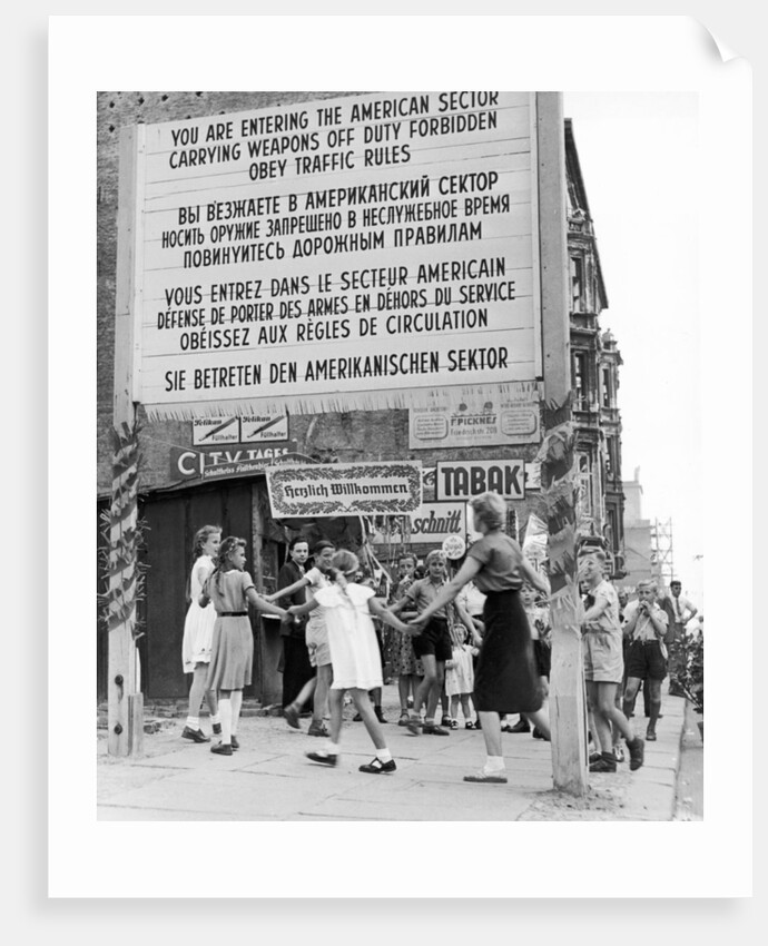 Berlin a city divided. Childrens party at the sector boundary Berlin 15th August 1953. This picture was taken from the eastern part of Friedrich strasse. It shows children playing in the vicinity of the sector boundary sign. Only a few months earlier in June during the workers� revolt in East Germany, American and Soviet tanks stood opposite each other in the Friedrich Strasse, creating a credible threat of force at the Allies sector line, Checkpoint Charlie. From that time on, the border crossing at Checkpoint Charlie symbolised the collision of two world systems of Democracy and Communism. Following the completion of the Berlin Wall, Checkpoint Charlie became one of the enduring symbols of the Cold War.