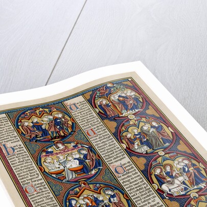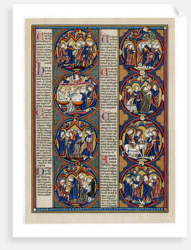 Bible scenes, late 13th century. The parable of the labourers in the vineyard, the mirace of the ten lepers, the episode of Zachaeus, and the mission of the two disciples to fetch the ass and her colt. These scenes are interpreted below as referring to the Last Judgement, the healing power of confession, the duty of leaving the world and turning to religion, and the contrast between the Jew and the Gentile. From the Bible Moralisee, produced in France in the late 13th century. Illustration from Illuminated Manuscripts in the British Museum, Miniatures, Borders, and Initials by George F Warner, series III, (British Museum, London, 1899).