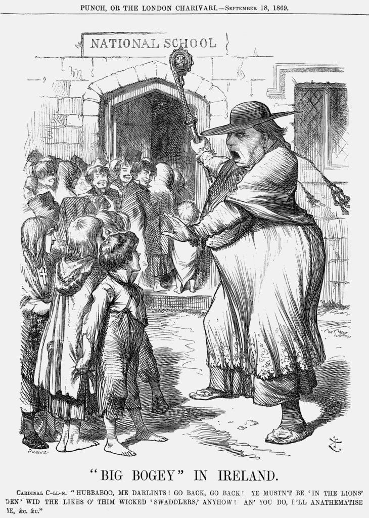 'Big Bogey in Ireland', 1869. The Cardinal forbids his little catholic children from joining their Protestant friends in the National School. Preserving their religious principles is obviously more important than educating them. From Punch, or the London Charivari, September 18, 1869.