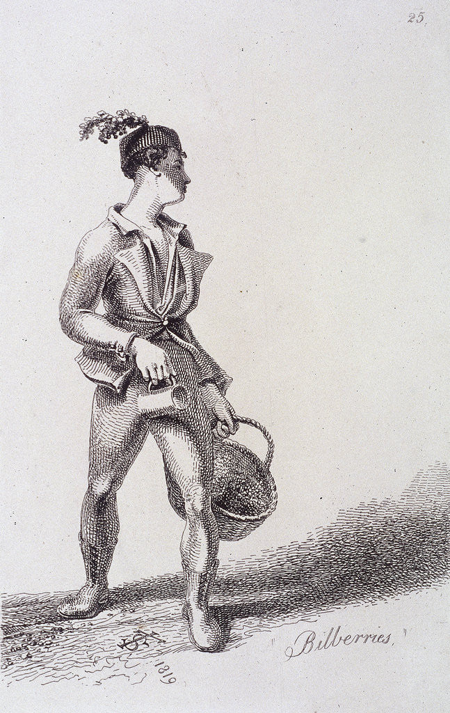'Bilberries', 1819. A bilberry seller, holding a basket and a jug, presumably for measuring out a portion of berries. From Cries of London, 1819.