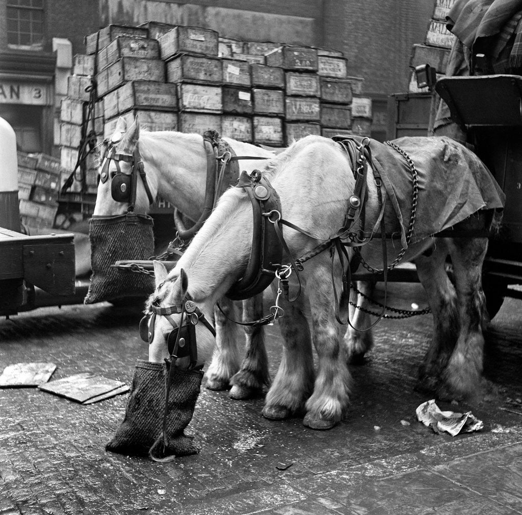 Bela Zola Life in the Mirror Series. Cart horses feeding from nose bags at Billingsgate Fish Market in the East End of London. 28th February 1954
