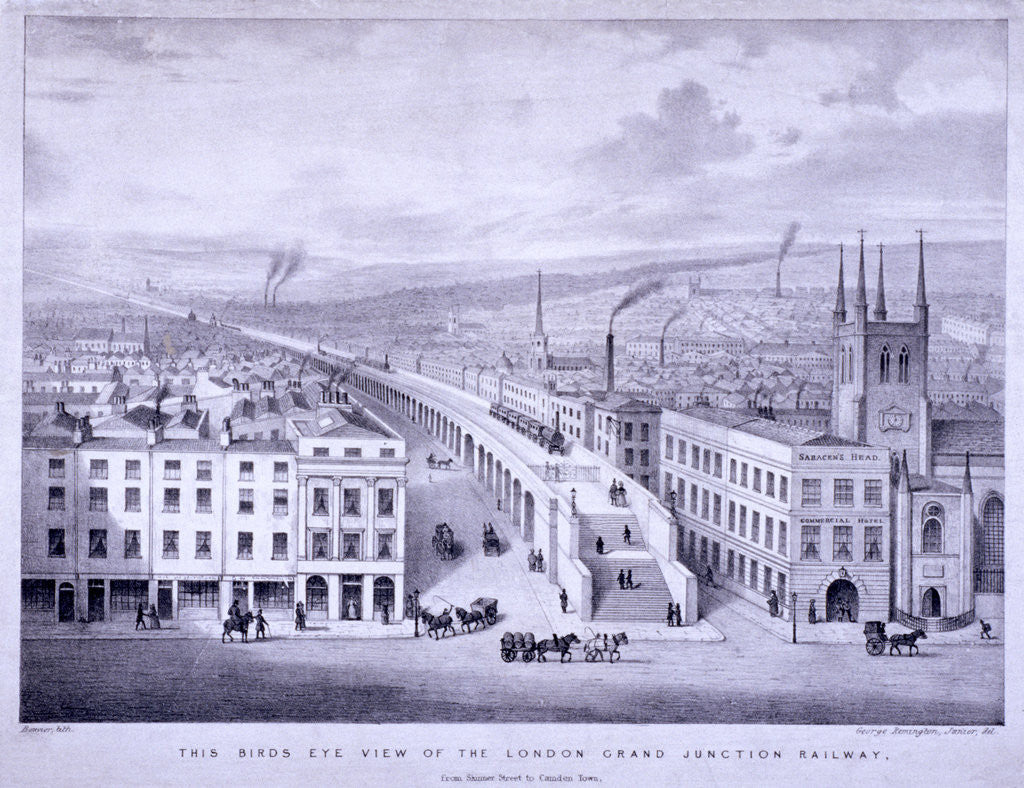 Birdseye view of the Grand Junction Railway from Skinner Street to Camden Town, London, c1835, with a street scene.